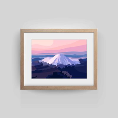 Whispers of Ngauruhoe captures the quiet strength of the snowcapped peak as it rises into a sky washed with pink and purple hues. The deep navy silhouette of the mountain contrasts with the soft evening light—an atmospheric moment where stillness speaks volumes.