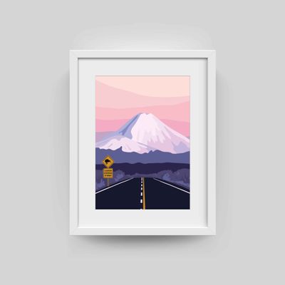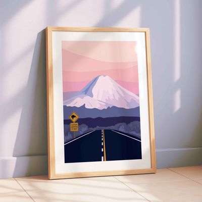 Mountain Road shows Mt Ngauruhoe dusted in snow, with a pink sky glowing above. The kiwi crossing sign adds a bit of character to the scene, a small reminder of home as the road stretches out ahead.