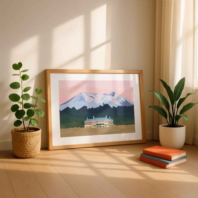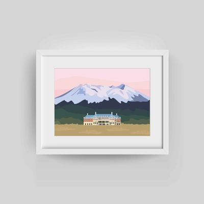 Chateau’s Guardian looks over Chateau Tongariro with Mt Ruapehu rising behind, dusted in snow. The pinky-hued sky softens the scene, giving the mountain and the hotel a quiet, watchful presence, like the chateau has its own guardian keeping an eye on things.