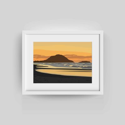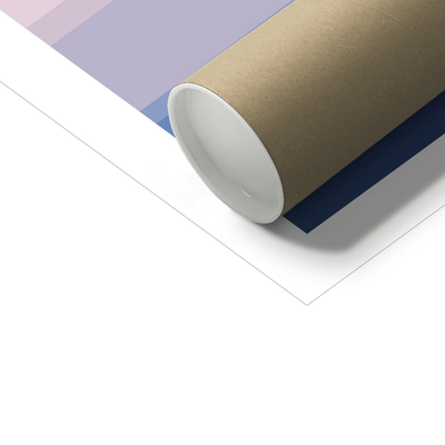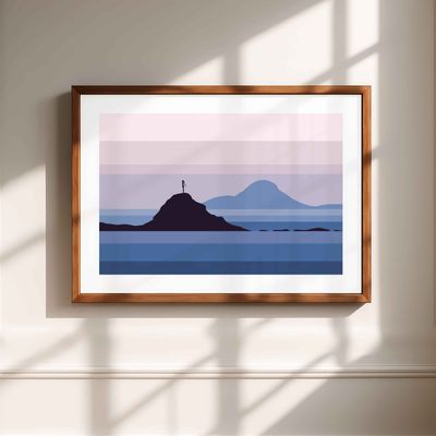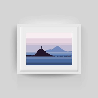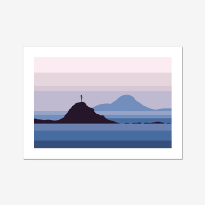 Moutohora Horizon is a print layering soft blue lines that fade into purples and pinks, tracing the sky above Wairaka and Moutohora Island at The Heads in Whakatāne, a view from my hometown, capturing the calm colours of a peaceful horizon.