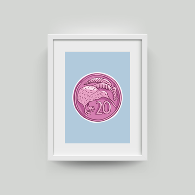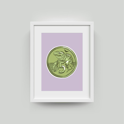 Tuatara Tales is an illustrated tribute to New Zealand’s old 5 cent coin, featuring the iconic tuatara. Set against a rich purple background, the green coin pops with detail, celebrating the unique charm of a creature that has survived unchanged for millions of years. This piece invites you to pause and appreciate the fascinating stories hidden in everyday objects.