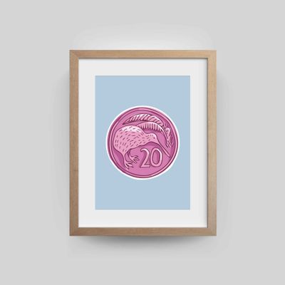 Kiwi Currency is an illustrated tribute to New Zealand’s old 20 cent coin, featuring the iconic kiwi. Set against a vibrant blue background, the pink coin stands out, celebrating a symbol that’s instantly recognisable and uniquely Kiwi. This piece shines on its own or as part of a charming set of three, perfect for collectors or lovers of local detail.
