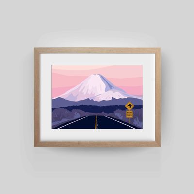 Mountain Road shows Mt Ngauruhoe dusted in snow, with a pink sky glowing above. The kiwi crossing sign adds a bit of character to the scene, a small reminder of home as the road stretches out ahead.