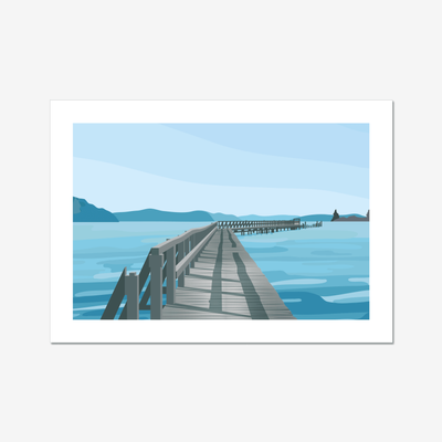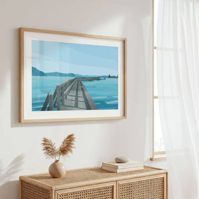 'Old Wharf' captures the Tokaanu Old Wharf on Lake Taupō, surrounded by layers of endless blue on a perfect blue-bird day. The rickety wharf sits quietly in the scene, the kind of spot that feels like it has a few good stories tucked away in its weathered old boards.